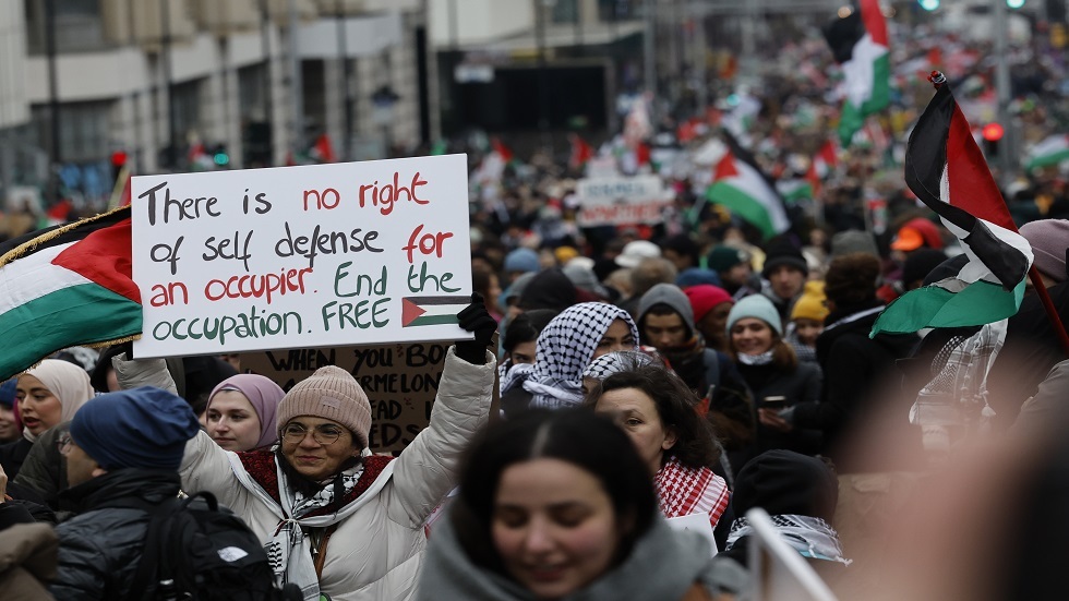 شارك آلاف المتظاهرين في بروكسل بمسيرة احتجاجية طالبوا فيها الاتحاد الأوروبي بالسعي الحثيث لوقف إطلاق النار فوراً في غزة واتخاذ إجراءات صارمة ضد إسرائيل.