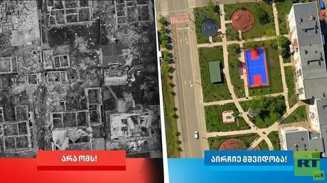 ويظهر الفيديو في الجزء الأيسر لقطات بالأبيض والأسود للدمار في أوكرانيا مصحوبة بشعار “لا للحرب”، بينما يعرض الجزء الأيمن لقطات ملونة لمعالم سياحية جورجية مع شعار “اختر السلام”.