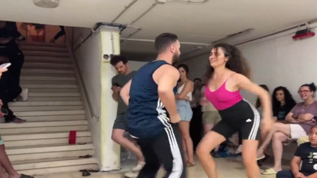 قدم مدرسان لرقصة السالسا عرضا ارتجاليا أمام أكثر من 100 إسرائيلي كانوا يختبئون في أحد ملاجئ مدينة يافا بتل أبيب أثناء الهجمات الصاروخية الإيرانية على إسرائيل.