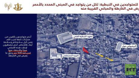 ونشر المتحدث باسم الجيش الإسرائيلي بيانا، جاء فيه: “إلى جميع السكان المتواجدين في منطقة النبطية وتحديدا في المباني المحددة في الخرائط المرفقة والمباني المجاورة لها.. أنتم تتواجدون بالقرب من منشآت ومصالح تابعة لحزب الله حيث سيعمل ضدها جيش الدفاع على المدى الزمني القريب.. من أجل سلامتكم وسلامة أبناء عائلتكم عليكم اخلاء المباني وتلك المجاورة لها فورا والابتعاد عنها لمسافة لا تقل عن 500 متر وفق ما يعرض في الخرائط”.
