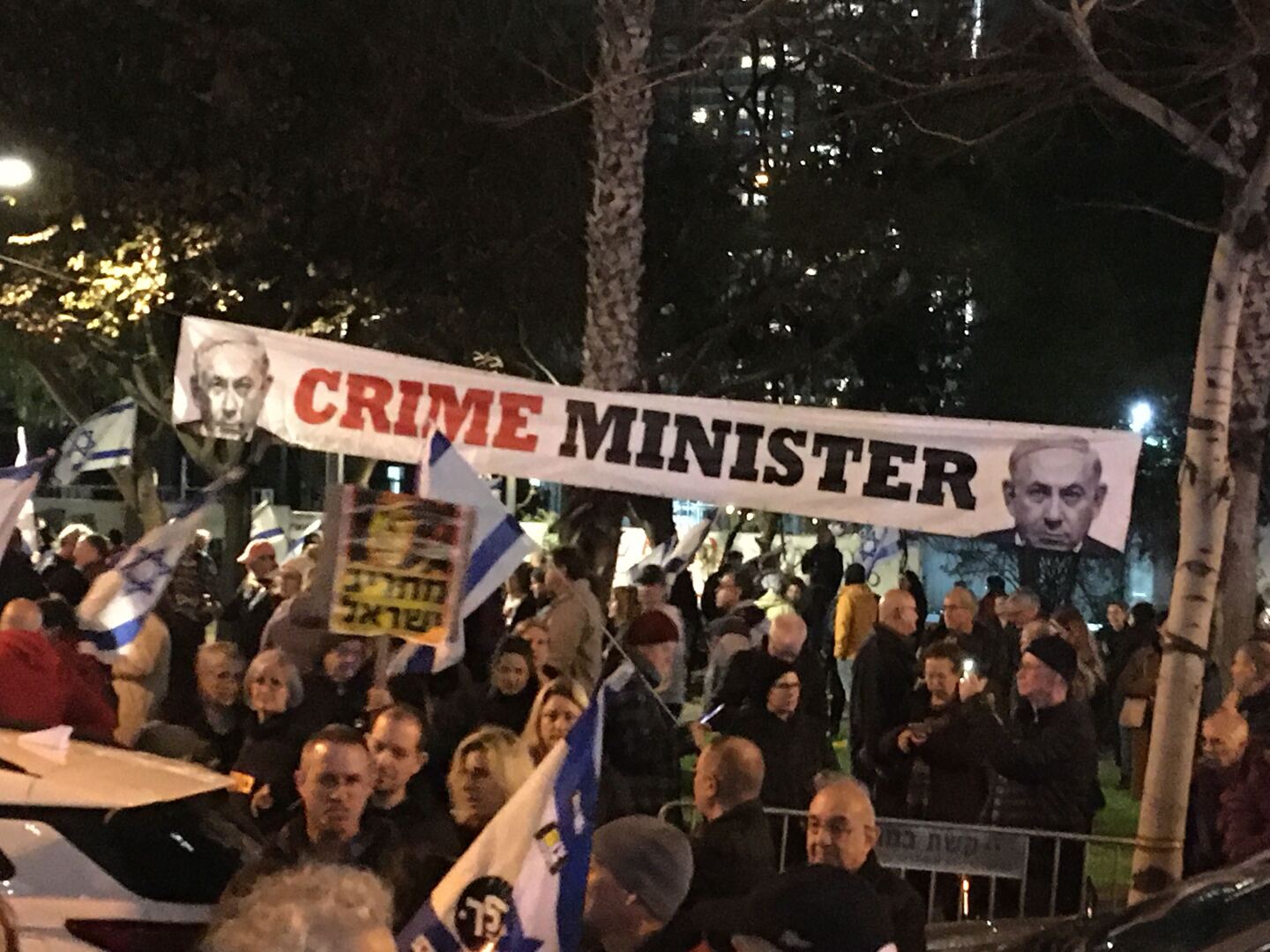 وردد المتظاهرون شعارات مؤيدة لإجراء انتخابات مبكرة ومطالبة باستقالة رئيس الوزراء الإسرائيلي بنيامين نتنياهو.