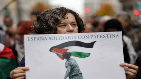 سيدة اسبانية تحمل يافطة مؤيدة لفلسطين خلال مسيرة في مدريدتابعوا RT على