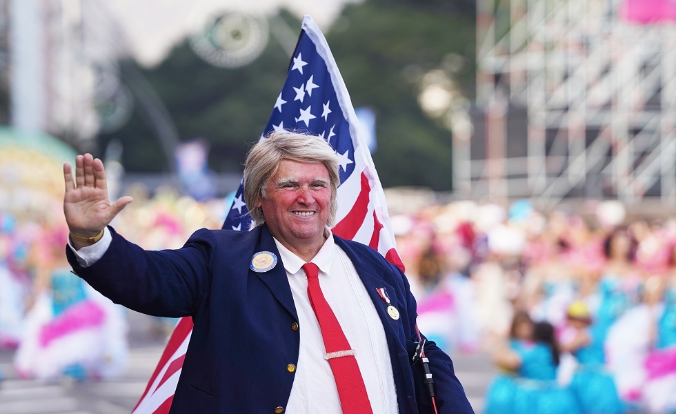 رجل يتنكر بملابس وشخصية الرئيس الأمريكي السابق دونالد ترامب