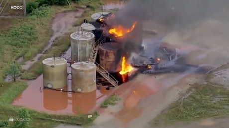 وذكرت وسائل الإعلام الأمريكية أن حريقا اندلع بعد أن اجتاحت العواصف المنطقة صباح اليوم الجمعة، إلا أنه من غير المعروف ما إذا كان سوء الأحوال الجوية هو سبب اشتعال النار في الصهاريج.
