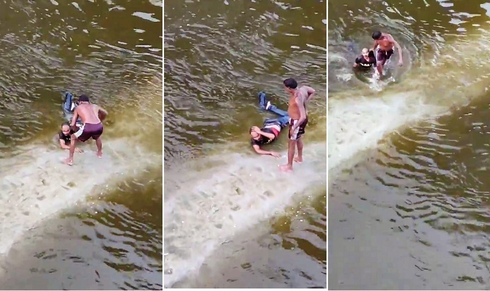 صفعه مرارا وتكرارا.. صياد ينقذ رجلا قرر الانتحار وزوجته في مياه نهر جومتي جنوب الهند (فيديو)صفعه مرارا وتكرارا.. صياد ينقذ رجلا قرر الانتحار وزوجته في مياه نهر جومتي جنوب الهند (فيديو)