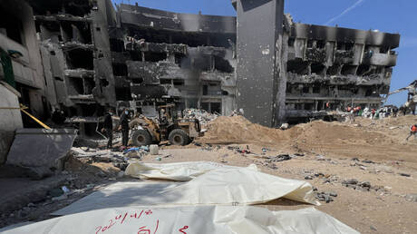 من عمليات انتشال الجثث وتحديد هوية الفلسطينيين الذين قتلوا خلال عمليات الجيش الإسرائيلي في مجمع الشفاء الطبي، 8 أبريل 2024.تابعوا RT على