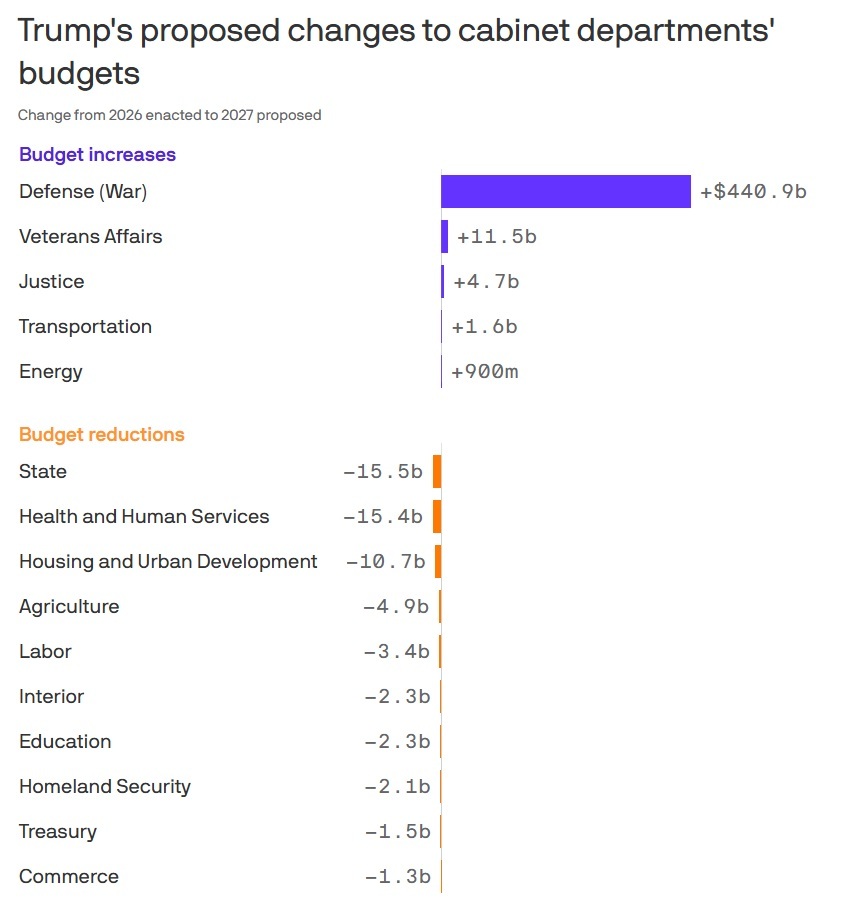 ووفق “أكسيوس” فإن ميزانية ترامب الجديدة أقرب إلى بيان لأهداف البيت الأبيض منها إلى مسودة تشريعية، ستعيد توجيه الحكومة الأمريكية نحو القوة العسكرية على حساب كل شيء آخر تقريبا.