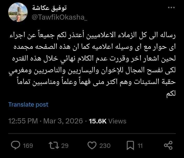 وفي تدوينة نشرها عبر حسابه الرسمي، أكد عكاشة اعتذاره عن إجراء أي حوارات صحفية أو تلفزيونية في الوقت الراهن، مشيراً إلى قراره بـ”تجميد” صفحته الشخصية والدخول في حالة من الصمت التام.