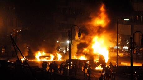 سيارات تحترق خلال اشتباكات بين الأمن ومتظاهرين وسط القاهرة – مصر 9 أكتوبر 2011.تابعوا RT على