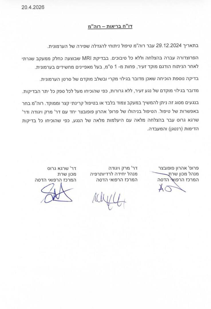 ووجه نتنياهو الشكر للأطباء الرائعين والطاقم الطبي في مستشفى هداسا في القدس، وقال لمواطني إسرائيل إن له طلبا واحدا فقط هو أن يعتنوا بصحتهم ويخضعوا للفحص ويلتزموا بتعليمات الأطباء.