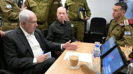 نتنياهو خلال اجتماع أمني في وزارة الدفاع مع وزير الدفاع الإسرائيلي يواف غالانت ورئيس أركان الجيش هرتسي هاليفيتابعوا RT على